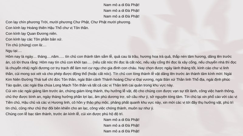 Một bài Văn Khấn Động Thổ Xây Nhà Chuẩn thường gồm phần kính cáo, nêu lý do động thổ, xin phép khai phá đất và khấn cầu phù hộ cho công trình an toàn, tiến triển thuận lợi. Văn khấn cần trang trọng, thành tâm, đọc to rõ ràng bởi người có trách nhiệm trong gia đình hoặc người được mượn tuổi nếu cần.
